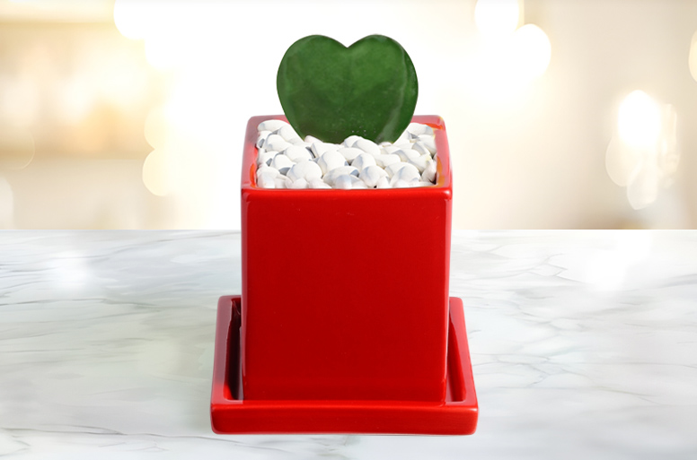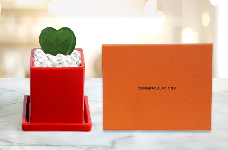 ハートの形をした可愛らしいグリーンに、鮮やかな赤いスクエア鉢を合わせた、特別な日の贈り物にぴったりの観葉植物祝電です。赤は「情熱」や「愛情」を象徴するカラーで、結婚祝い・記念日・誕生日など、大切な想いを伝えるシーンにおすすめ。