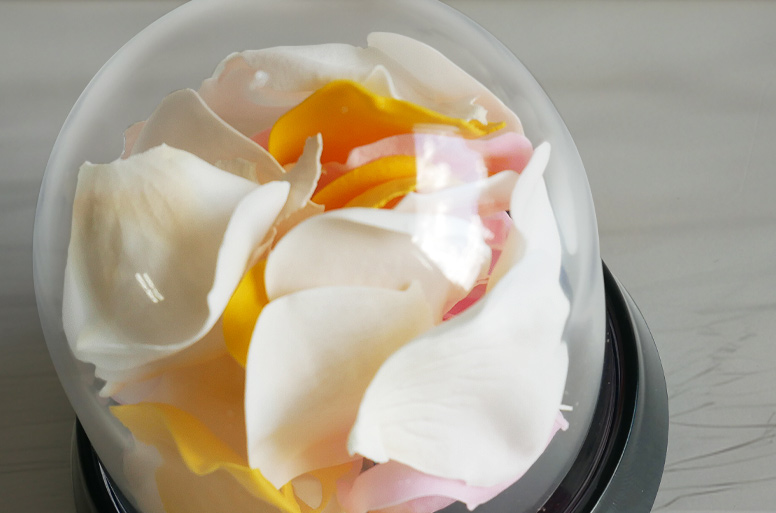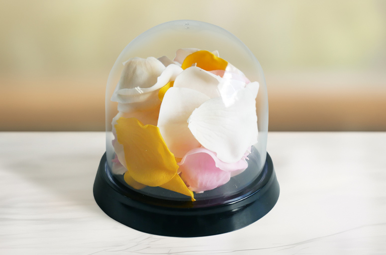 花びらはドームで覆われているため、ほこりや外気の影響を受けにくく、葬儀後もご自宅や法要の場でそのまま飾っていただけます。水やりや特別なお手入れが不要な点も、贈る側・受け取る側双方に配慮した設計です。