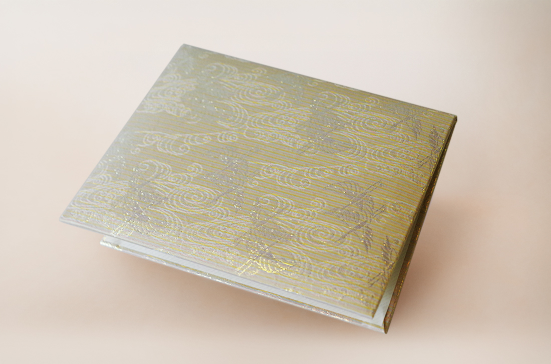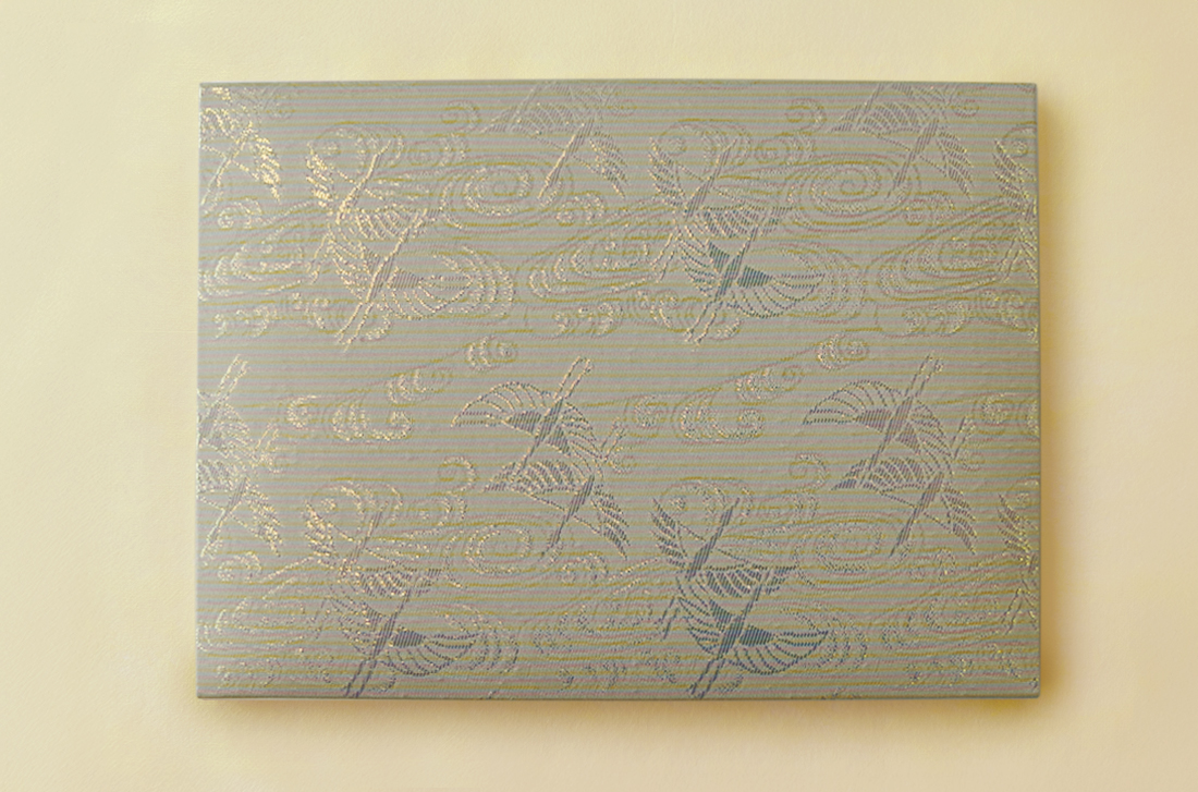 伝統ある西陣織で繊細に織り上げられた、二羽の鶴が舞う上品な台紙「双鶴(そうかく)」。淡い金糸と柔らかな色糸を重ねることで、見る角度によって光沢が移ろう高級感のある仕上がりです。