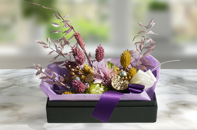 紫を基調にした上品な彩りで想いを伝える、プリザーブドフラワー弔電