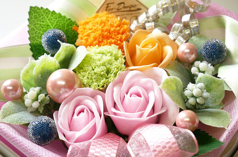 可憐な花々をモチーフにした香るバスソープギフト。ピンクやオレンジ、グリーンを組み合わせた華やかなアレンジが、見る人の心を和ませます。