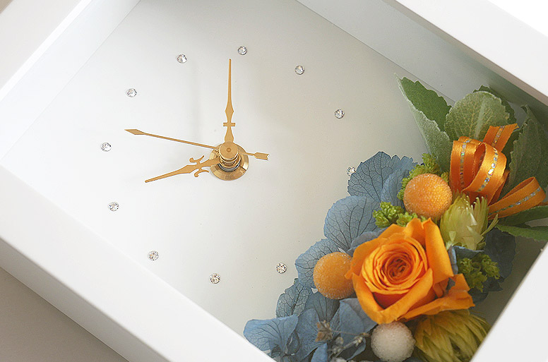 これからの幸せな時を紡ぐ時計は、新たな門出を迎える方にぴったりの祝電ギフトです。オレンジのバラをアクセントに添えた優しいデザインを、ホワイトの木製フレームにアレンジ。