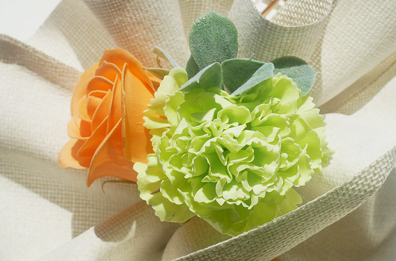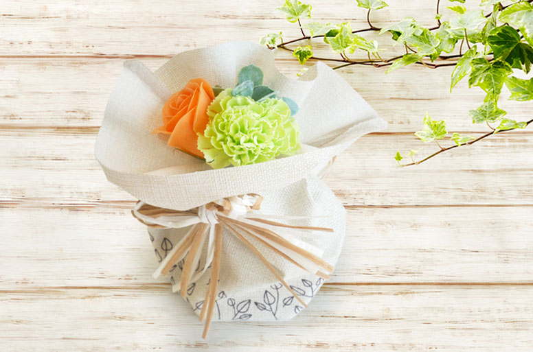 ふんわりと香るオレンジのバラとライムグリーンのカーネーションを麻布風ラッピングとラフィアリボンで仕上げたソープフラワーです。