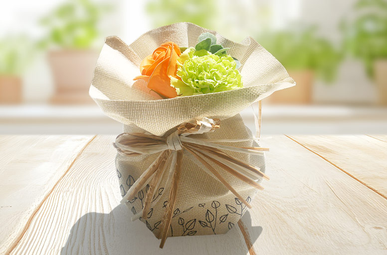 オレンジローズとライムグリーンカーネーションを巾着風に包んだ、ナチュラルなソープフラワー電報です。