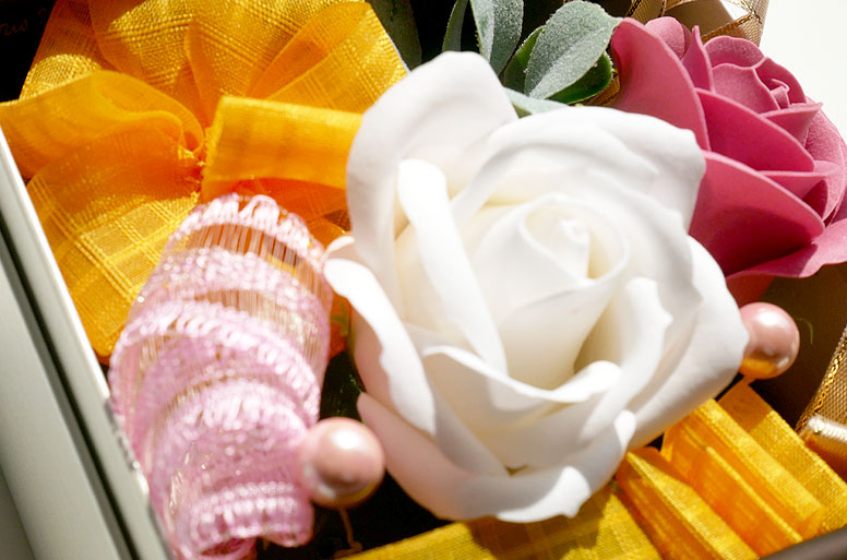 白とピンクのバラを上品にあしらった、華やかでやさしい限定ソープフラワー祝電