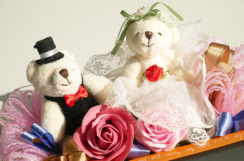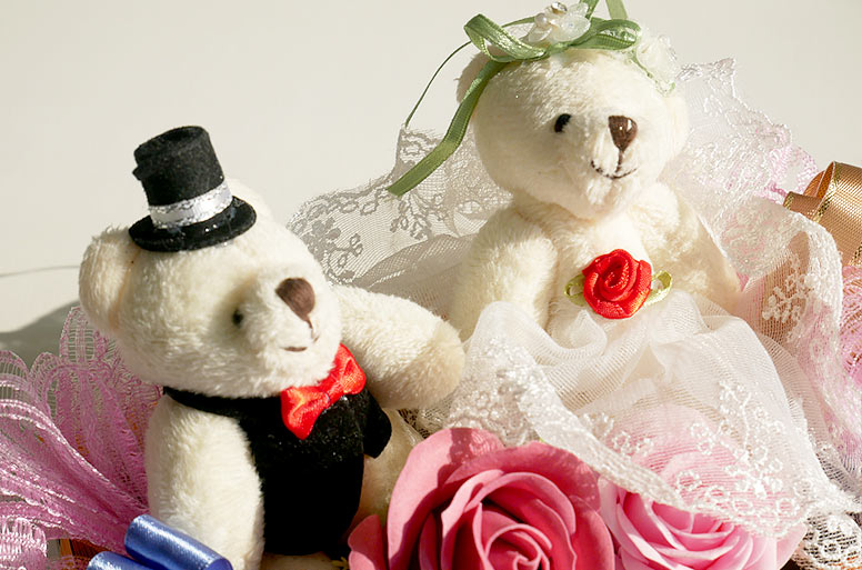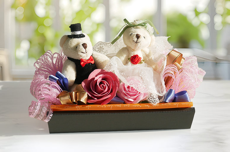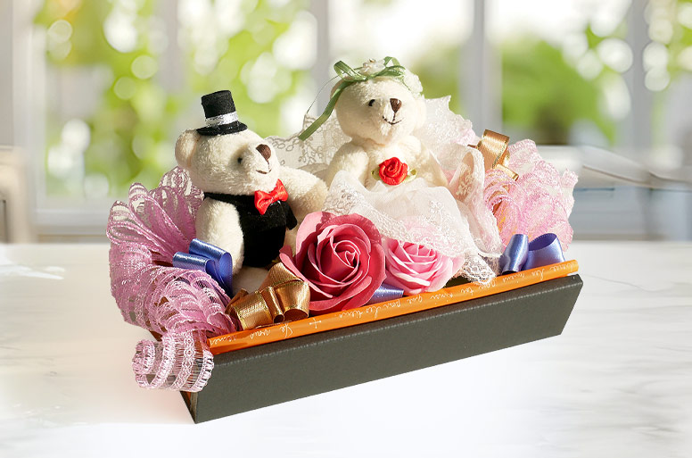 祝福の気持ちを形にした、ウェディングベアとソープフラワーの特別アレンジ
